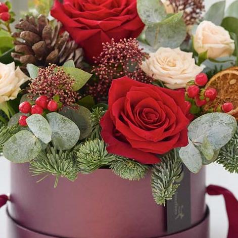 The cutest Christmas hatbox – it makes a great centrepiece. The arrangement will be handcrafted using blooms in rich red and green shades, with peach and cream highlights and pops of burgundy and cerise.