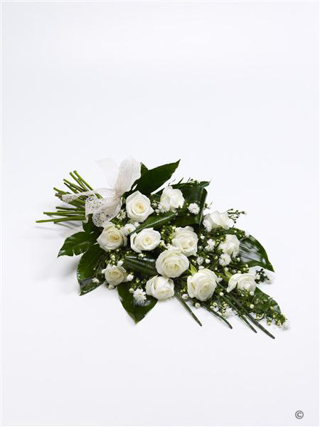 Elegant folded aspidistra and aralia leaves are nestled amongst large-headed white roses to create this stunning sheaf which is finished with delicate white September flower and foliage.