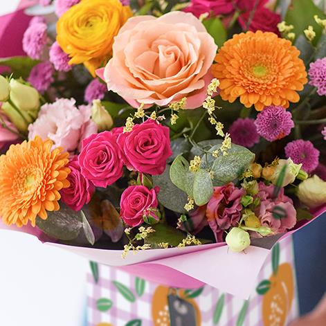 A sweet little gift box with a bright bouquet handcrafted by a florist inside.