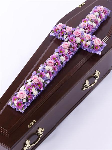 A classic cross covered with a mass of pink and lilac flowers including roses, spray carnations, spray chrysanthemums and September flower. Approximate height 153cm (5ft).