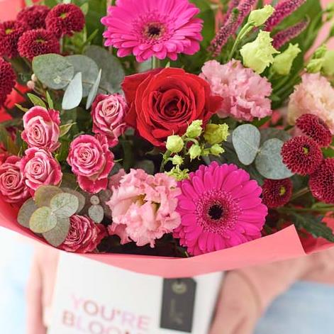 A gorgeous mix of romantic blooms, exquisitely arranged by an artisan florist and safely tucked in a beautiful giftbox. It'll feature blooms in classic Valentine's colours including cerise, burgundy and soft pink.