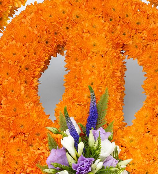 A mass of orange double spray chrysanthemums forms the Khanda tribute which is finished with a spray of white freesias, lilac lisianthus and blue veronica.