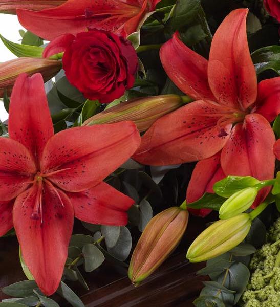 This striking casket display features a selection of fresh Asiatic Lily and large-headed Rose in shades of rich red. The flowers are carefully arranged with amaranthus, ruscus, eucalyptus and aralia leaves. Approximate height 153cm (5ft).