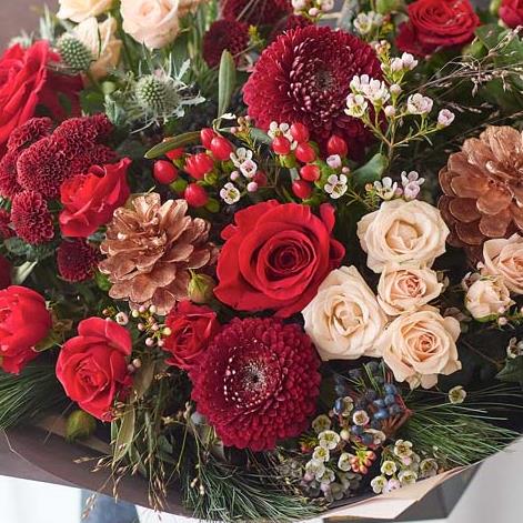 One of our bigger festive bouquets, this one is a stunning arrangement of fresh Christmassy flowers, expertly chosen by a local florist.