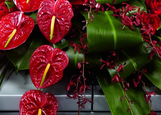 A very distinctive casket spray in shades of rich red including Rose, carnations, gladioli, anthuriums and orchids along with red hypericum, leucadendron and aspidistra leaves.