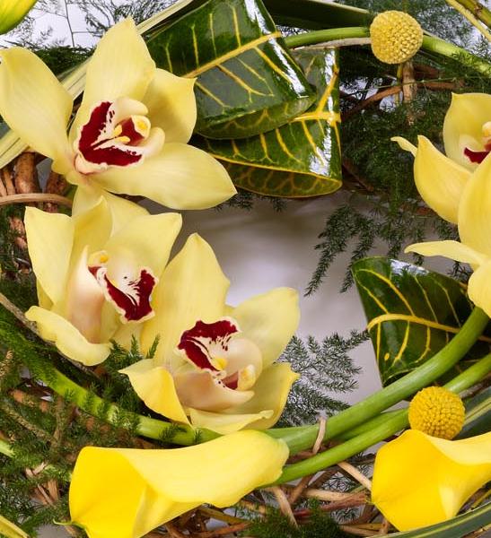 Yellow calla Lily and cymbidium orchids are entwined with cornus Stems, craspedia and asparagus fern around a circular willow frame to create this woodland wreath. Approximate diameter 40cm (15 inches).